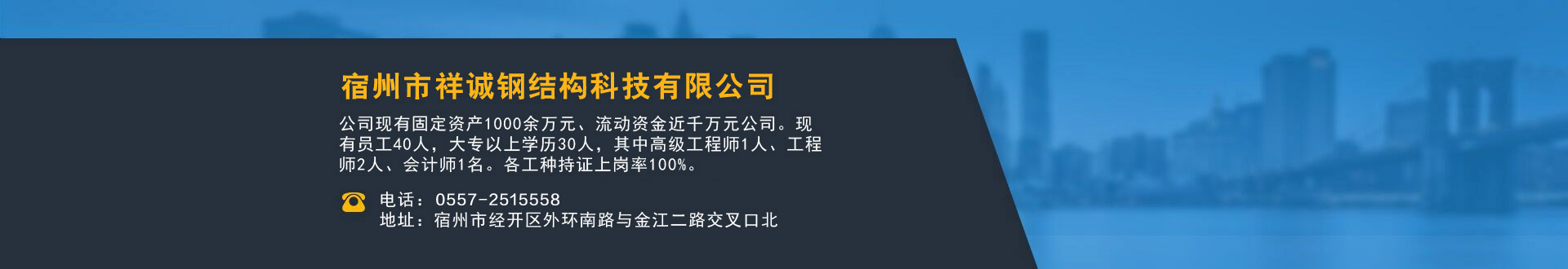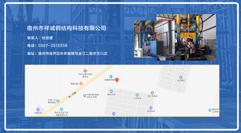 宿州市祥誠鋼結(jié)構(gòu)科技有限公司位于宿州市經(jīng)開區(qū)外環(huán)南路與金江二路交叉口北,公司是一家以建設(shè)產(chǎn)業(yè)化為目標,匯集大型鋼結(jié)構(gòu)廠房、彩鋼活動房設(shè)計、制作、安裝施工一條龍服務(wù)的知名鋼結(jié)構(gòu)公司。公司現(xiàn)有固定資產(chǎn)1000余萬元、流動資金近千萬元公司。現(xiàn)有員工40人,大專以上學歷30人,其中高級工程師1人、工程師2人、會計師1名。各工種持證上崗率100%。高效化的年青團隊為公司帶來了蓬勃發(fā)展的動力,全體員工以務(wù)實的態(tài)度,拼搏的精神,創(chuàng)造著企業(yè)的每一天。      公司組織結(jié)構(gòu)嚴格按現(xiàn)代企業(yè)制度設(shè)計,管理機構(gòu)設(shè)置合理,制度完善,各部門分工明確...